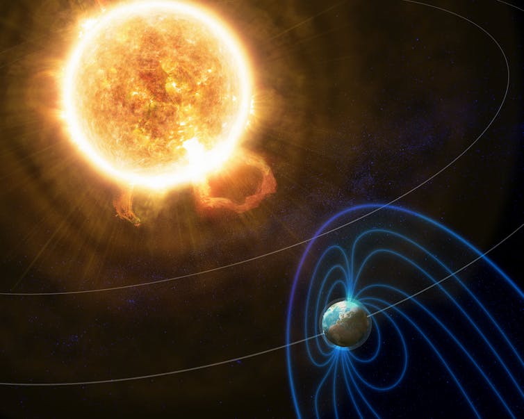 Earth’s magnetosphere acts as a shield, protecting the planet from solar particles.